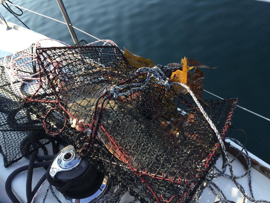 Stille rolig morgen med sol fra skyfri himmel. Flott utseiling fra Korssund men det går ikke fort for her er det både trangt og grunt. Spent på hva som befinner seg i krabbeteinene. Den første var helt tom og agnet var ikke rørt. Den andre var mye tyngere å dra opp så her må det være noe. Veldig overraskende innhold. Sammen med to store flotte krabber hadde også en skate rotet seg inn i teina. Den ser jo ikke veldig fristende ut, og jeg var også skeptisk til piggene på halen. Har hørt at de er giftige?? Fant ut at det bare er skatevingene som er spiselige og riktig tiberedet smaker de visstnok utmerket. Skata hører til haifamilien og urinstoffene går raskt ut i kjøttet når den blir avlivet. Så da må den fileters raskt, noe som ikke var helt enkelt i båten nå. Derfor havnet den ut i havet igjen. Krabbene ble kokt da vi kom fram til Fedje utpå dagen. Tror dette er feriens varmeste dag så det ble en flott seilas. Fant ut at vi skulle bestille middag på restauranten for menyen så grei ut, men dette var jo bare tøys. Det eneste de hadde var pizza og karbonader. Hele serveringen var en stor vits, vi ventet en times tid på pizzaen og til slutt kom det en sur gubbe og slang den på bordet hos oss. Stedet og lokalitetene har jo potensiale til så veldig mye mer.
