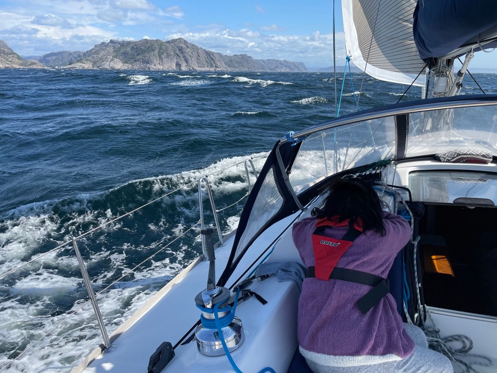 Tidlig oppe igjen for vi har en lang dag foran oss. Dro innom Haugesund for å fylle diesel (64l) men fikk seilet en del idag. Frisk vind etterhvert så det ble et rev i forseilet. Etterhvert ble også sjøen veldig urolige og vinden for mye rett bakfra så det ble ikke nok trøkk i seilet så bommen slang mye i bølgene, og da blir det en svart sky over hodet til skippern. Ned med seil og motor den siste biten inn til Egersund. Og her blir vi liggende for vinden bare øker og øker og da er ikke etappen herfra til Mandal grei. God plass i gjestehavnen og fordriver dagen med byrunde og spaserturer i terrenget. Håper vi ikke må ligge her til mandag før det løyer, men det kan se slik ut akkurat nå. Ligger og gynger inne i havnen som et godt beskyttet for været.