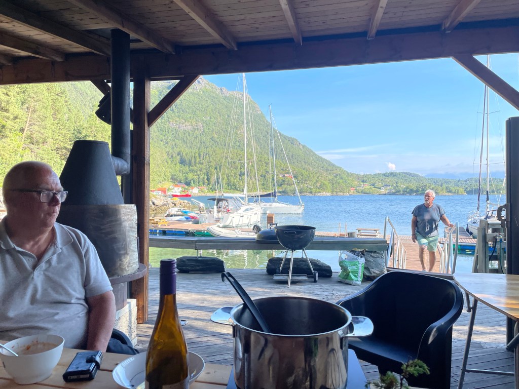 Odd kom rett etter frokost og tok oss med på en byvandring med b.l.a. Varden og vanndammene. Utpå ettermiddagen dro vi sammen til seilforeningen sitt flotte anlegg i Oldenborg i Møstavågen. Her er det flytebrygger, grillhytte og det man trenger av fasiliteter. Hjemmelaget fiskesuppe med selvfisket torsk og laks som vi fikk på Veiholmen. Utpå kvelden reiste Odd hjem igjen med sin båt og vi overnattet sammen med en annen båt.