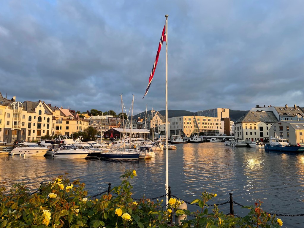 En seiler er jo en rastløs sjel. Selv om vi har hatt mange hyggelige dager i Kristiansund som vi ikke ville ha vært foruten er det godt å komme ut på havet igjen. Vinden løyer, men det er fremdeles litt lurvete sjø over Hustadvika, men det roer seg merkbart når vi nærmer oss Bud. Ender opp i Ålesund og får en bra plass helt innerst i Brosundet. Kom inn utpå kvelden sammen med en annen seilbåt og han ga på det han kunne for å komme inn i havna før oss. Han la seg i det ytre havnebassenget og lå der og gynget og skvalpet seg igjennom natten mens vi fant en fin rolig plass helt innerst i Brosundet. Noen folk er jammen meg litt rare. Fish and chips fra Norges beste Brosundet kiosk smakte umerket. (Sorry Odd, men denne smaker bedre enn den vi får i Kristiansund). Nå som vinden også har løyet viser været seg fra sin gode side med en solfylt varm kveld.