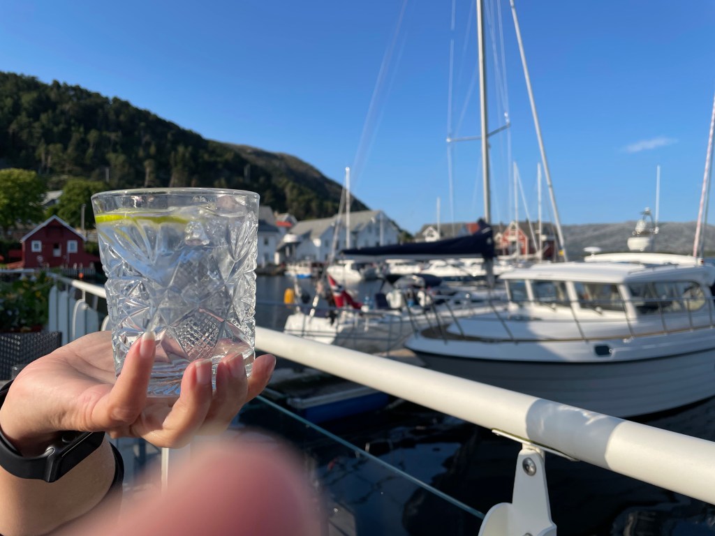 Vi velger å gå Kvernesfjorden på innsiden av Averøy til Håholmen. Omtrent helt vindstille så da blir det å gå for motor. God plass i gjestehavnen på Håholmen men det er fullt på hotellet her så mye liv å røre. Restauranten er full, men med sin magiske overtalelsesevne greier John atter en gang å skaffe oss et bord til middag, riktignok ikke før 20:30 men det er helt greit. Kanskje det er enklere for han er eneste utlending på øya. Gjestene på hotellet er bare nordmenn.